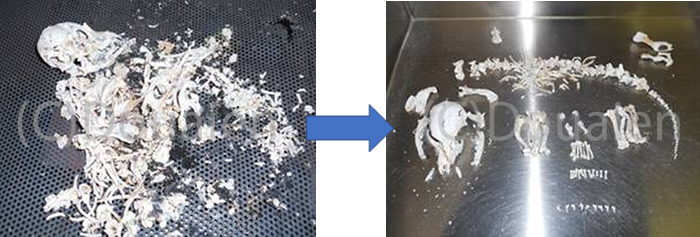 副葬品の灰や煤を取り除き、ペットの寝姿を模してご遺骨を並べてお目にかけるようにしています。